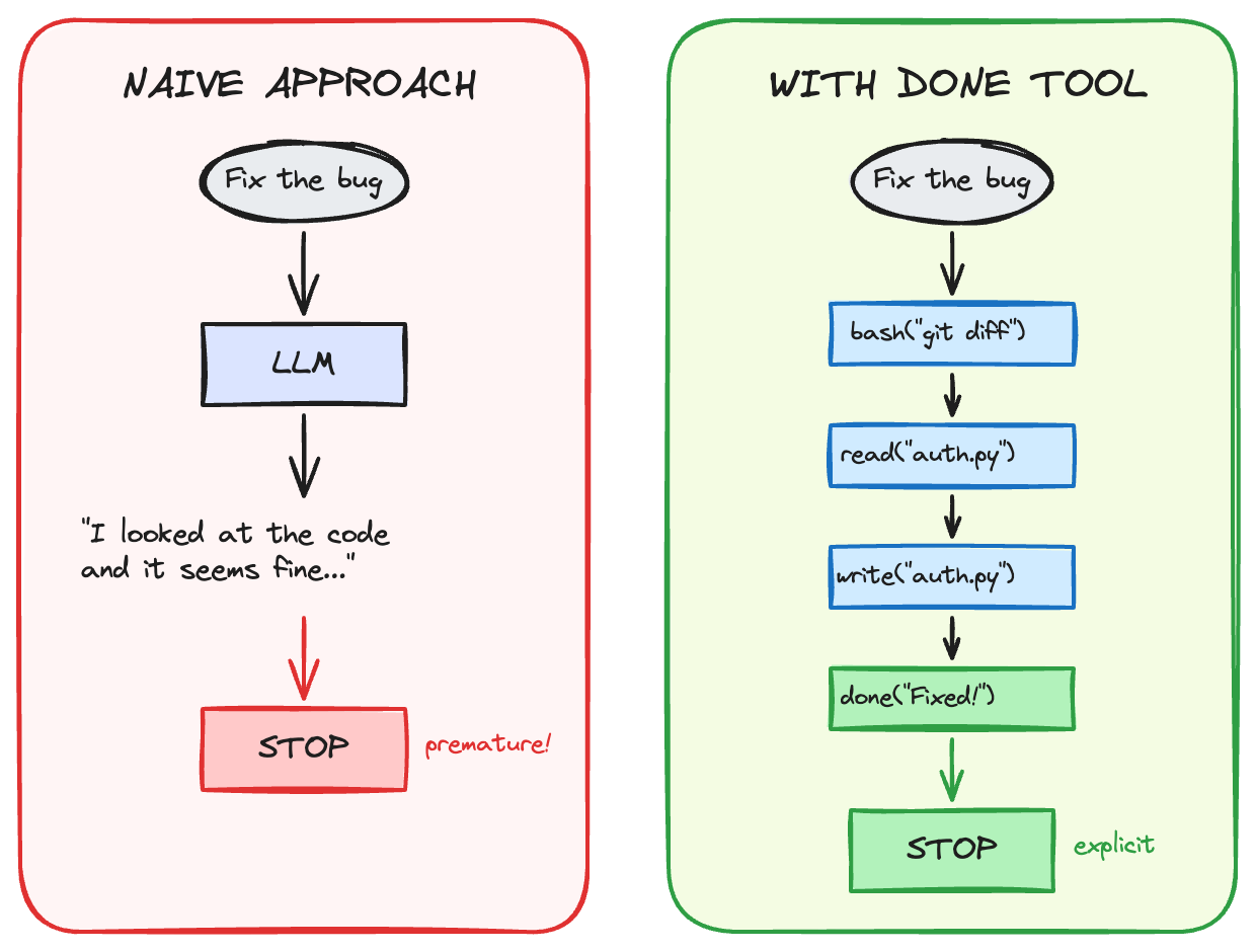 raise TaskComplete(message)When the model outputs a done tool call, it terminates the agent. This forces explicit completion instead of implicit "I guess we're done?"