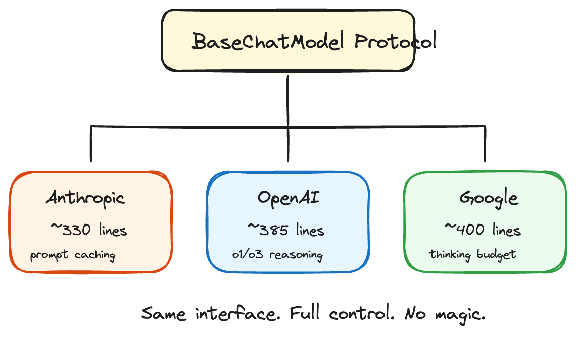 async def ainvoke(self, messages, tools) -> ChatCompletion: ...Same interface. Full control over caching, serialization, provider quirks. No magic. No surprises.