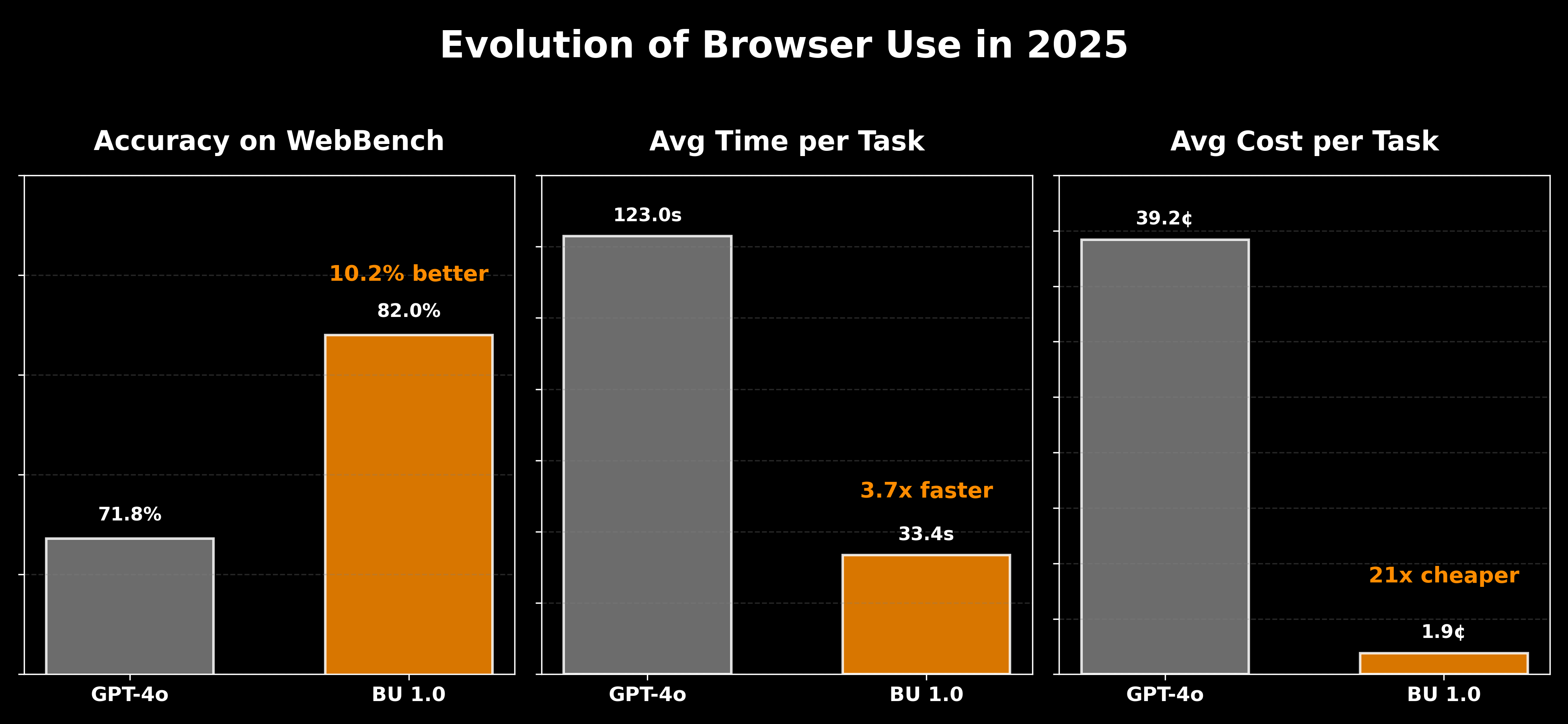 We track three core metrics for our browser agents: accuracy, speed, and cost. In one year, the accuracy improved from 71.8% to 82.0%. But more importantly, we reduced average task time from 123 seconds to 33.4 seconds and dropped the cost from staggering 39.2¢ to 1.9¢ per task. It now costs less than 2 cents to complete a simple browsing task.